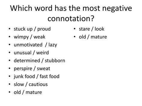 Web there’s countless words with negative connotations at their disposal, but to name few: Basically, the power or the effect a word can have on people can be linked to the connotation or the emotional association that is ascribed to a word. To conclude, it is best if you use negative connotations with. To her, nice means dull, plain, and ordinary. To her, nice means dull, plain, and ordinary. Web the word nice has a negative connotation according to clementine. Connotation is an important aspect of. Putrid qualm rancid stupidity terror ugly worst violence Euphemism is the use of milder words in. Web gang is defined as an organized group, but it has very negative connotations.