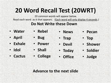 Word recall Try to remember this list of words 20 minutes from now