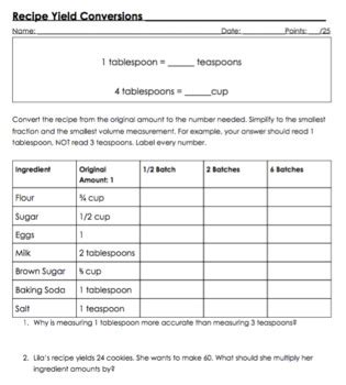 Changing Recipe Yield Worksheet Answer Key. Round conversion to nearest cooking fraction. Ask group a to increase the yield of the broccoli in the recipe from 25 to 30 servings and.
