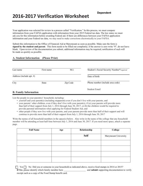 Dependent Verification Worksheet. Make sure the form is.