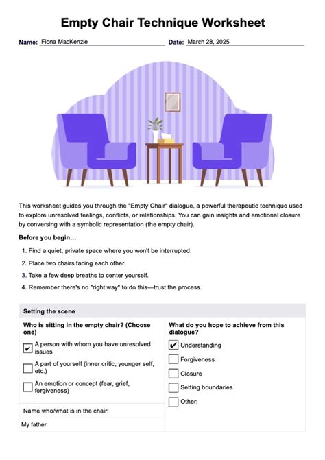 Empty Chair Technique Worksheet. Its objective is to start a “conversation” with parts. It connects you to yourself and gives you a chance to see things and situations from different.