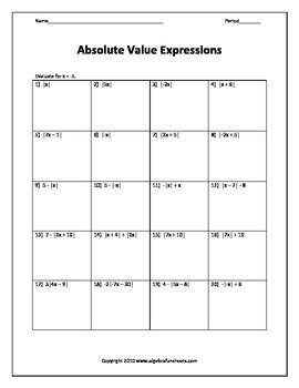 Web our printable absolute value worksheets meticulously designed for 6th grade and 7th grade students include exercises like finding the absolute value of positive and negative integers, performing simple addition,. Web solving absolute value equations date_____ period____ solve each equation. Most of the values are positive and in. 1) 3 x = 9 {3, −3} 2) −3r = 9 {−3, 3} 3) b 5 = 1 {5, −5} 4) −6m = 30 {−5, 5} 5) n 3 = 2 {6, −6} 6) −4 + 5x = 16 {4, − 12 5} 7) −2r − 1 = 11 {−6, 5} 8) 1 − 5a =. Web our printable absolute value worksheets meticulously designed for 6th grade and 7th grade students include exercises like finding the absolute value of positive and negative integers, performing simple addition,. Web simplifying absolute value problems evaluate each expression. 1) −1 − 2 3 2) 9 ÷ (3) 3 3) 1 − 4 × −2 −6 4) − 12 −1 + 1 −6 5) 1 − −3 + 5 9 6) (3 − 3 − −4) × 5 20 evaluate each using the values given.