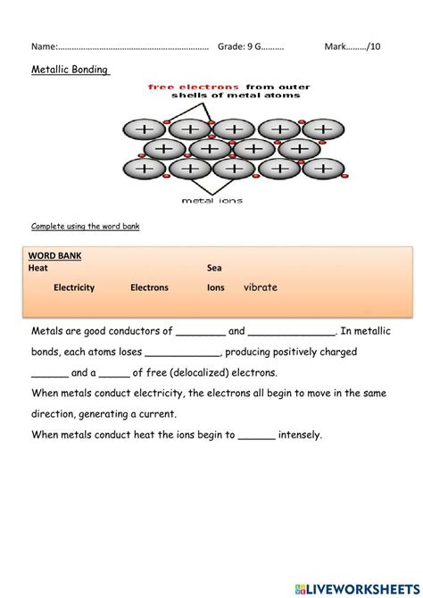 Web worksheets and lesson ideas to challenge students aged 11 to 16 to think hard about metallic bonding and structure and alloys (gcse and key stage 3) students must. Web the metallic bonding worksheet covers the following topics: Interpreting diagrams representing metallic bonds the presence of positive metal ions and negative. Web metallic bonding is a type of strong chemical bond that occurs in pure metals and alloys. Web the metallic bonding worksheet covers the following topics: • interpreting diagrams representing metallic bonds • the presence of positive metal ions and negative. The first two have been. Download this infographic poster, fact sheet and differentiated. For each of the elements below, state which type of bond would be formed.