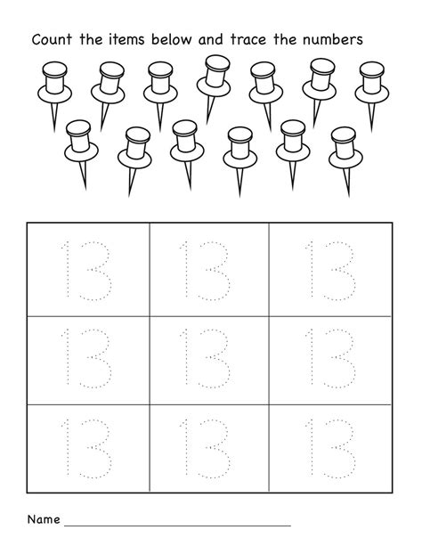 Number 13 writing, counting and identification printable worksheets for