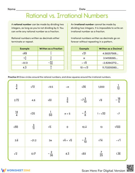 Rational Vs Irrational Worksheet. Rational numbers can be written as a fraction of two integers, while irrational numbers cannot. Identifying rational and irrational numbers math.