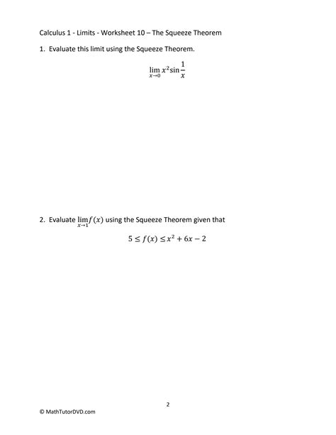 Squeeze Theorem Worksheet. We want to find lim x → 0 x sin ( x). Direct substitution and other algebraic methods don't seem to work.