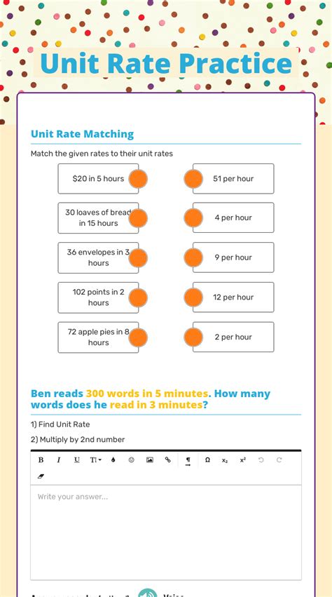 Unit Rate Practice Worksheet. The sheets involve working out unit rates and finding the best value unit rate. On these printable worksheets, student will learn the concept of a unit rate, and they will practice solving word problems related to linear.