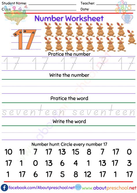 Number 17 writing, counting and identification printable worksheets for